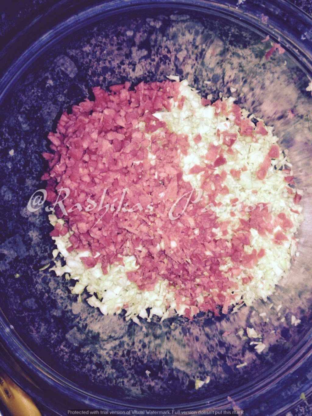add onions and saute for 10-15 seconds. add all the finely chopped vegetables.